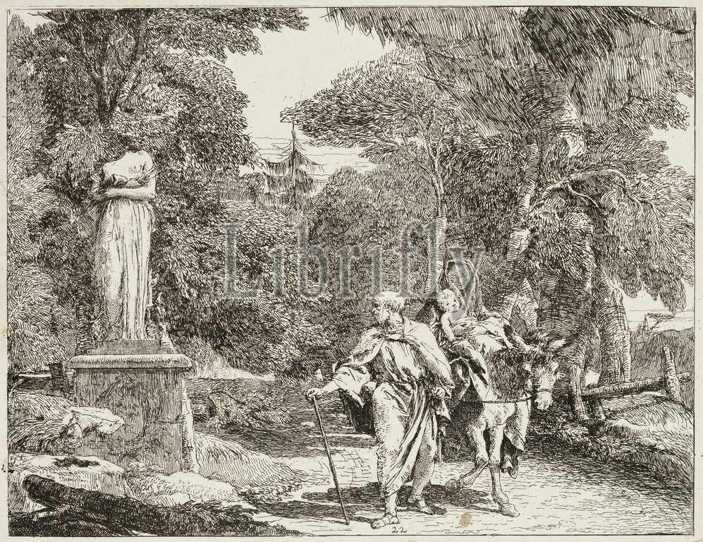Giovanni Domenico Tiepolo, Italian, 1727-1804, The Holy Family Passing a Statue, the Head of Which Falls to the Ground, ca. 1753, etching printed in black ink on laid paper, Plate: 7 1/2 × 9 5/8 inches (19.1 × 24.4 cm)
