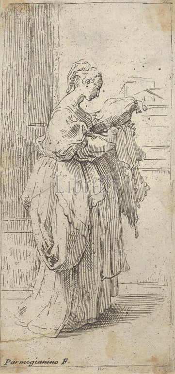 Girl carrying a cushion, seen in profile facing right, 1590–1690, Etching, Sheet (Trimmed): 6 5/16 × 3 1/16 in. (16.1 × 7.8 cm), Prints, Attributed to Guido Reni (Italian, Bologna 1575–1642 Bologna), After Parmigianino (Girolamo Francesco Maria Mazzola) (Italian, Parma 1503–1540 Casalmaggiore), After a drawing by Parmigianino in Parma.