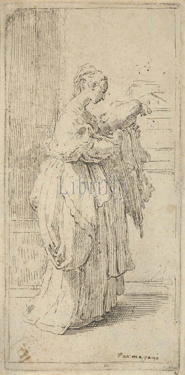 Girl carrying a cushion, seen in profile facing right, 1590–1690, Etching, Sheet (Trimmed): 6 7/16 × 3 1/4 in. (16.4 × 8.2 cm), Prints, Attributed to Guido Reni (Italian, Bologna 1575–1642 Bologna), After Parmigianino (Girolamo Francesco Maria Mazzola) (Italian, Parma 1503–1540 Casalmaggiore), After a drawing by Parmigianino in Parma.