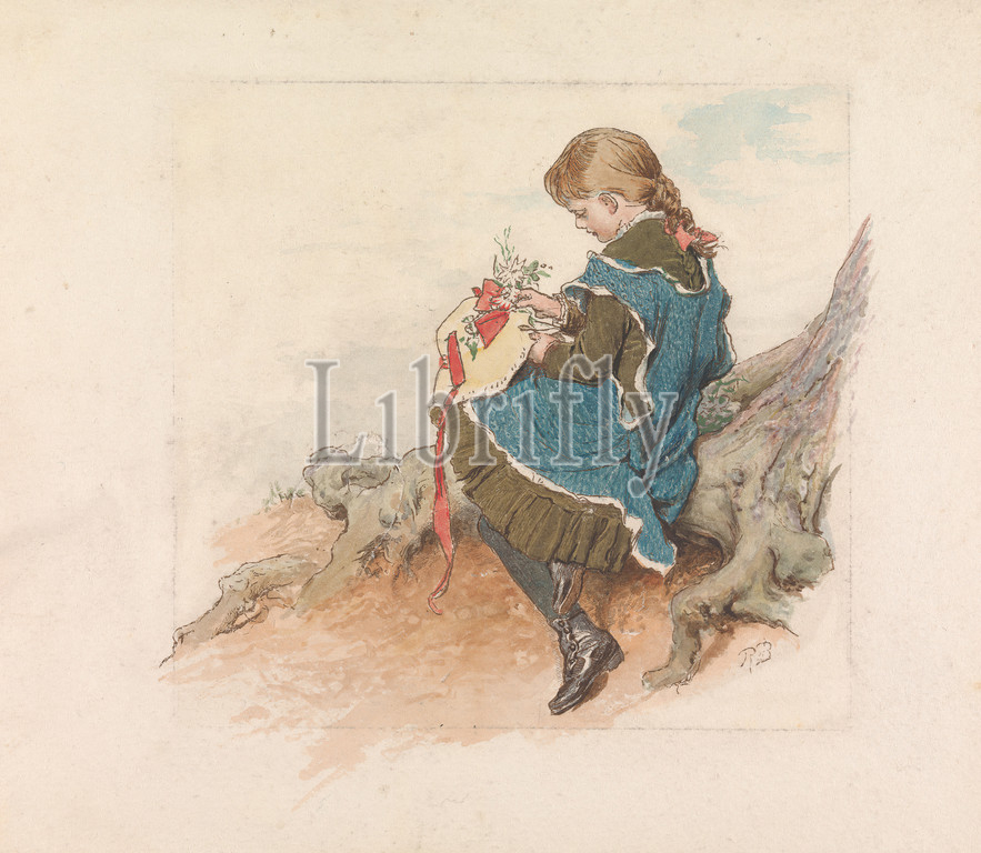 Girl Pinning Flowers, Hat, Print, Robert Barnes, 1840–1895, British, Robert Barnes, 1840–1895, British, Wood-engraving, watercolor, moderately thick, slightly textured, cream wove paper, Sheet, Image, apron, braid, flowers, plants, genre subject, girl, Nature, playing, ribbon, sitting, sunbonnet, tree, trunk