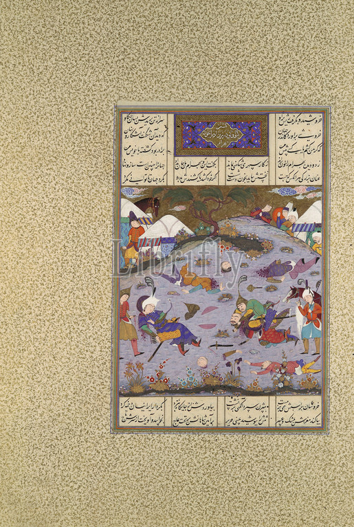 Giv Avenges Bahram, Slaying Tazhav, Folio 248r, Shahnama, Book, Kings, Shah Tahmasp, ca, 1525–30, Iran, Tabriz, Opaque watercolor, ink, silver, gold, paper, Painting, H, 7 x W, 6 3/4, 17.8, 17.2 cm, Codices, Painting attributed to Qadimi, active ca., 1525–65, aftermath, battle, Bahram returns, scene, find, lost whip, mortally wounded, Tazhav, army, Aggrieved, rides close, Turanian camp, under, cover, darkness, takes, prisoner
