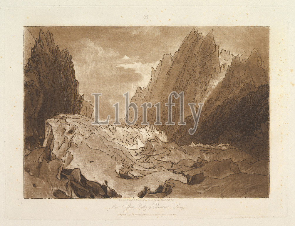Mêr de Glace, Valley, Chamouni-Savoy, Liber Studiorum, part X, plate 50, 23, 1812, Etching, mezzotint, third state, five, Finberg, plate, 7 x 10, 17.8 25.4 cm, Prints, Turner distilled, ideas, landscape, Latin, Book, Studies, series, seventy prints, plus, frontispiece published, 1807, 1819, establish, compositions, brown watercolor, drawings, etched outlines, copper plates
