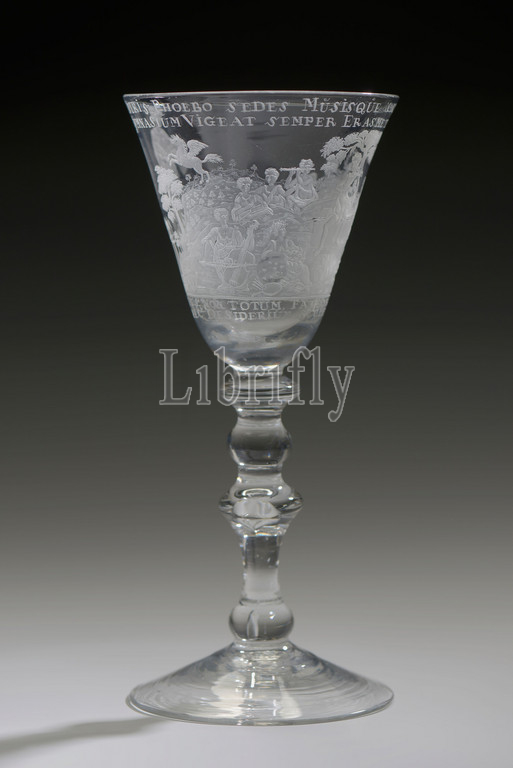 Goblet engraved, Apollo, nine muses, opposite, statue, Erasmus, wineglass drinking, glass, drinkware, tableware, holder, lead, gram free, blown, formed radgraving, polishing, goblet, occasional, Wine glass, clear colorless, Pontil, mark, under round, ascending, hollow, base, Massive, inverted, balustere, stem, lower part, knots, enclosed air, bubble, upper, rounded, sharp knot, Rounded, trumpet-shaped, chalice, fire-rounded edge, Radgravure, Illustris Phoebo, Sedes, Musisque, sacrata, Gymnasium, Vigeat, semper, Erasme, tuum, Totus non, totum, Fateor, capit, orbis, Erasmum, Haec, Desiderium, sculpta, tabella, refert, magnificent place, dedicated, Phoebus Apollo, Muses, your Gymnasium, powerful, whole world, confess, do, contain, entire Erasmus, engraved plate, narrates, []