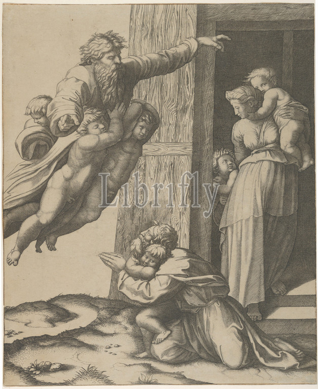 God carried, angels, appearing, Noah, family, Flood, ca, 1513–15, Engraving, 12 1/16 x 9 7/8, 30.6 25.1 cm, Prints, Marcantonio Raimondi, Italian, Argini, ca., 1480–before, 1534, Bologna, After Raphael, Raffaello Sanzio or Santi, Urbino, 1483–1520, Rome