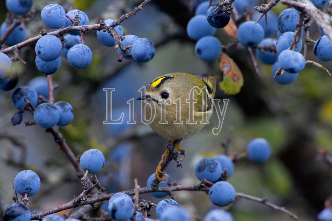 Goldcrest perched on branch between blue berries, Regulus regulus