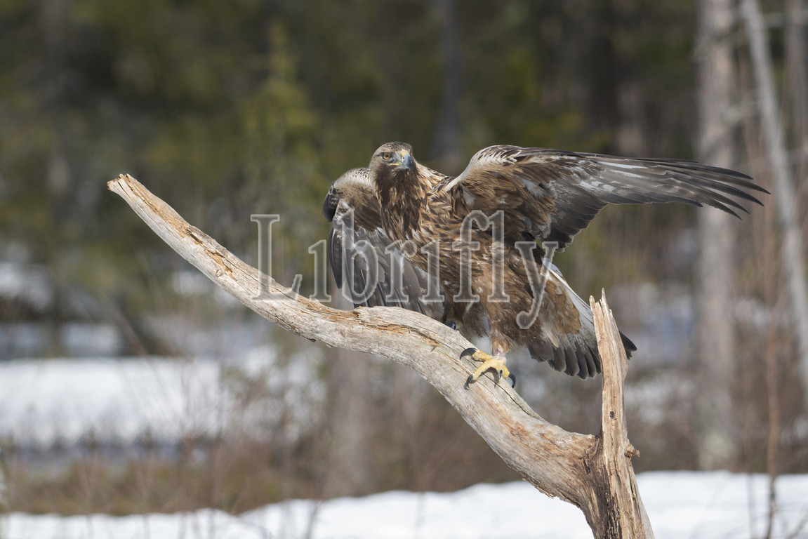 Golden Eagle perched at tree trunk, Aquila chrysaetos, Sweden