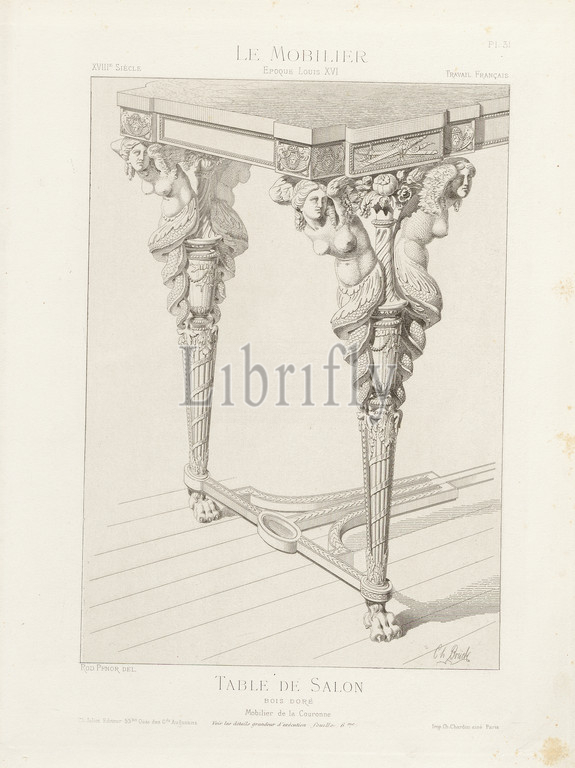 Golden wood coffee table, Crown Furnishings, Saloon table, 18th century, Louis XVI style, Signed, Rod., Pfnor del, Ch. Brück, Ch. Juliot, Editeur, Imp. Ch. Chardon ainé, Pl. 31, p. 8, Pfnor, Rodolphe, del., Brück, Ch., sc., Juliot, ed., Chardon, Ch. ainé, imp., Rodolphe Pfnor, Le mobilier de la couronne, des grandes collections publiques, particulières du XIIIe siècle, XIXe siècle, mobilier civil, Mobilier religieux, Meubles, tentures, tapisseries, bronzes, objets d'art de toutes les époques accompagnés de dessins, grandeur d'exécution, Paris, Ch, Juliot, Editeur, Librairie Générale de L'Architecture, des Travaux Publics, 1874-1876