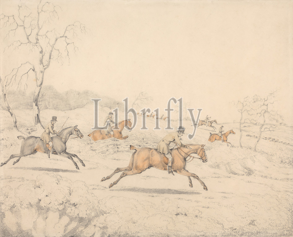 Gone Away, Henry Thomas Alken, 1785–1851, British, Samuel Henry Gordon Alken, 1810–1894, British, Graphite, watercolor, medium, slightly textured, blued white, wove paper, Sheet, fence, field, galloping, horseback riders, horseback riding, horses, animals, hunt, hunters, hunting, jumping, landscape, men, sporting art, trees