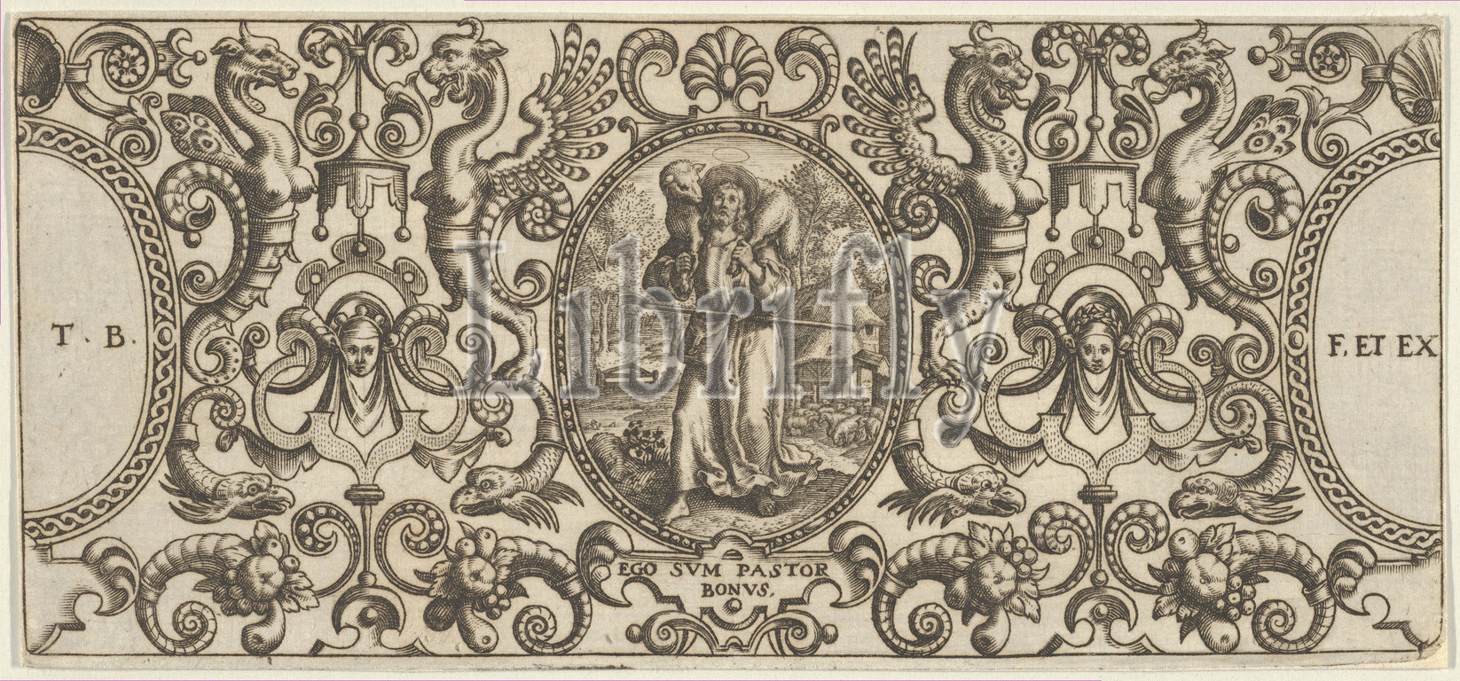 Good Shepherd, Grotisch fur alle Kunstler, 1580–1600, Engraving, Sheet, 2 5/8, 5 3/4, 6.7, 14.6 cm, Theodor de Bry, Netherlandish, Liège, 1528–1598, Frankfurt, scene, framed, oval, center, surrounded, symmetrical ornamental, design, masks, grotesques, cornucopias, left, right edge, segmented ovals, artist, signature