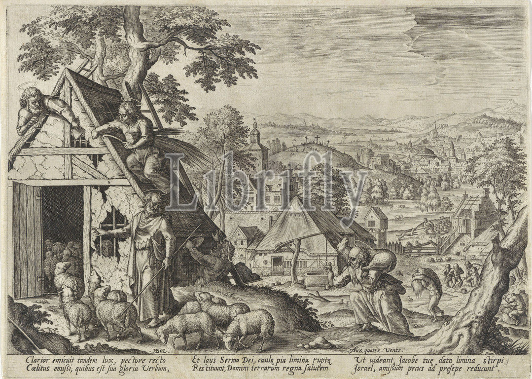Good shepherd, good shepherd leads, flock, sheep, stable, roof, repaired, two angels, background, hilly landscape, church, farmsteads, representation, margin, six-line text, Latin, good shepherd, Christ, defending, wolves, I am, John 10, 1-16, shepherd, lamb, shoulders, 1570, 1601, paper, engraving