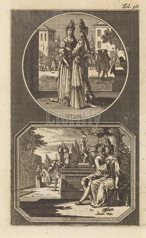 Gossiping women, sex couple, Two, lottery spells, own number, n, 766, performance, round list, two gossiping women, busy street, Under n, 772, representation, octagonal frame, garden, couple, love, foreground, background two, pairs, tooth image, Venus, Cupid, print, page number, top right, lovers, kissing, French, architectonic garden, formal garden, story, Aphrodite, Jan Goeree, mentioned, object, 1705, paper, engraving, w 85 mm × h 139 mm