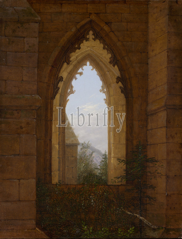 Gothic Windows, Ruins, Monastery, Oybin, ca, 1828, Oil, canvas, 17 x 13 1/4, 43.2 33.7 cm, Paintings, Carl Gustav Carus, German, Leipzig, 1789–1869, Dresden, church, fine Gothic, tracery, founded, 1369, deserted, 1546, later embraced, motif, German Romantic, artists, Carus visited, August 1820, drawing, Staatliche Kunstsammlungen, served, study, painting