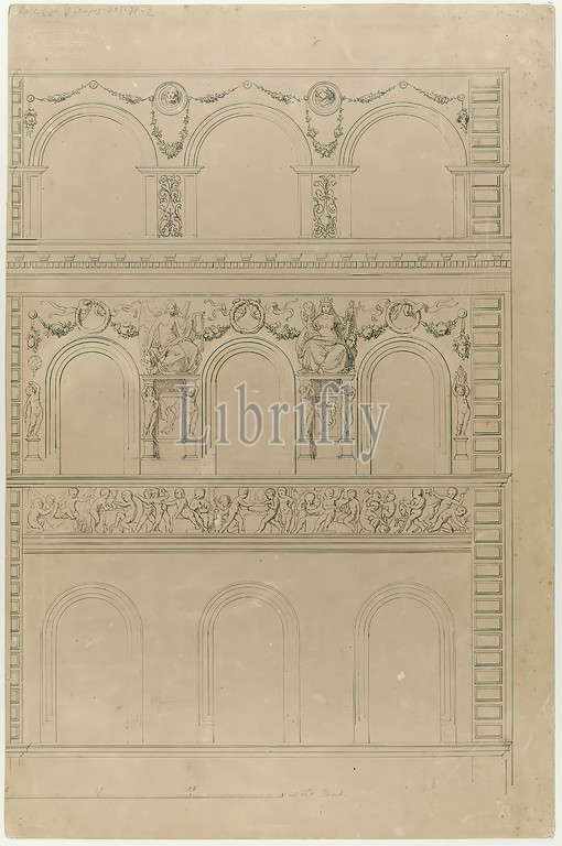 Gottfried Semper, Carl Gottlieb Rolle, sgraffito decorations, residential, office building, pharmacist Wilhelm Semper, Hamburg, Right half, façade, 2nd-4th floor, old stock, 1903, cardboard, ink, pen-and-ink drawing, sheet size, inscribed, recto, in lead, Rolle, zu G, Semper-71, -21-2, dry stamp, recto, ATELIER, FÜR ARCHITEKTUR UND INDUSTRIE, B, WRITER, DRESDEN, design drawings, facade, house, building, facade decorations, architecture, cupids, putti, pharmacy, architecture, personifications, garlands, flower thread, ornament
