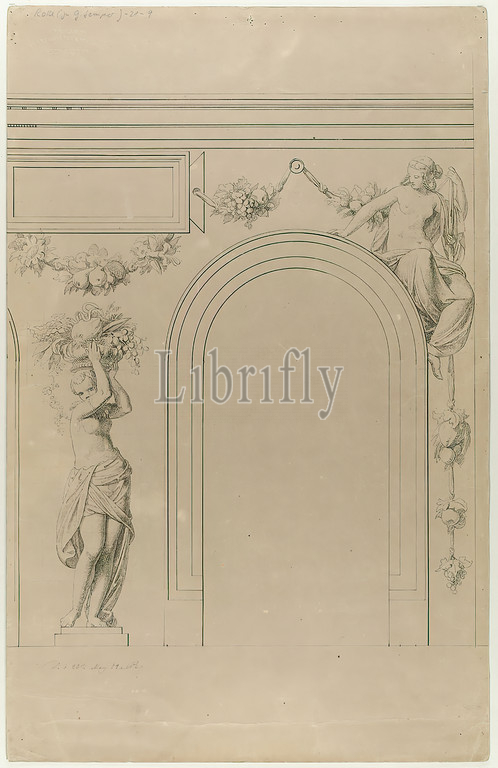 Gottfried Semper, Carl Gottlieb Rolle, sgraffito decorations, residential, office building, pharmacist Wilhelm Semper, Hamburg, Window frame, carrying figure, Chinese woman, 1st floor, old stock, 1903, cardboard, ink, pen-and-ink drawing, sheet size, monogrammed, inscribed, dated, recto, in ink, Altona am 5, Juny 1844 CR, inscribed, recto, in lead, Rolle, zu G, Semper-71, -21-11, design drawings, facade, house, building, facade decoration, architecture, garlands, flower thread, ornament, peoples, nationalities