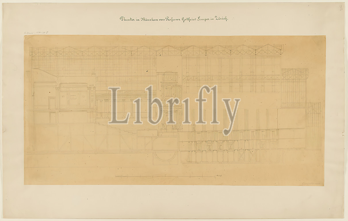 Gottfried Semper, design for the provisional Richard Wagner Festival Theater in the Glaspalast, Munich (Project A). Floor plan of the auditorium. Longitudinal section, tracing paper, drawing, sheet size: height: 34.2 cm; width: 68.3 cm, signed: recto: in lead: Gottfried Semper, inscribed: recto on the cardboard: in ink: Theater in Munich by Professor Gottfried Semper in Zurich, in lead: G. Semper 179-21-5, 9, a, draft drawings, cut through an architecture, opera house, architecture, architectural drawing or model, draft, plan of a building