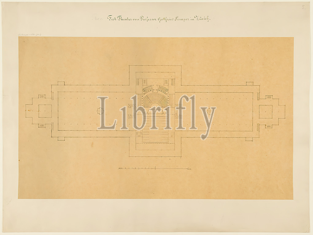 Gottfried Semper, design for the provisional Richard Wagner Festival Theater in the Glaspalast, Munich (Project A). Floor plan, tracing paper, drawing, sheet size: height: 34 cm; width: 57.5 cm, inscribed: recto on the cardboard: in ink: Prov. [in lead added] Festival Theater of Professor G. Semper in Zurich, in lead: G. Semper 179-21-3, draft drawings, design, plan of a building, opera house, architecture, architectural drawing or model