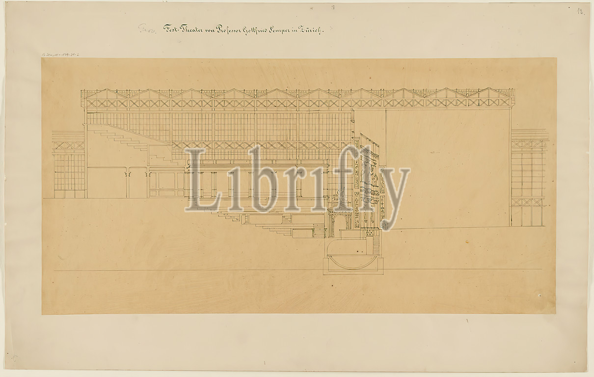 Gottfried Semper, design for the provisional Richard Wagner Festival Theater in the Glaspalast, Munich (Project B). Longitudinal section, present from Manfred Semper, tracing paper, drawing, sheet size: height: 34,2 cm; width: 68,7 cm, inscribed: recto on the cardboard: in ink: Prov. [in lead added] Festival Theater of Professor Gottfried Semper in Zurich, in lead: G. Semper 179-21-2, 12, c, design drawings, section through an architecture, opera house, architecture, architectural drawing or model