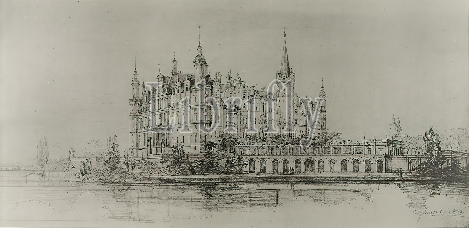 Gottfried Semper, design for the reconstruction of the castle, Schwerin. Perspective of the castle lake side, old stock, probably a 1903, cardboard, collotype print, image size: height: 17.5 cm; width: 35.8 cm, signed: exposed: G. Semper, inscribed: recto on the cardboard: in lead: design for Großherz. Schloß Schwerin, after pencil drawing, stamp: recto: address, prints, printed matter, castle, palace, lake, architecture, tower, castle, castle, hist. building, locality, street, Schwerin