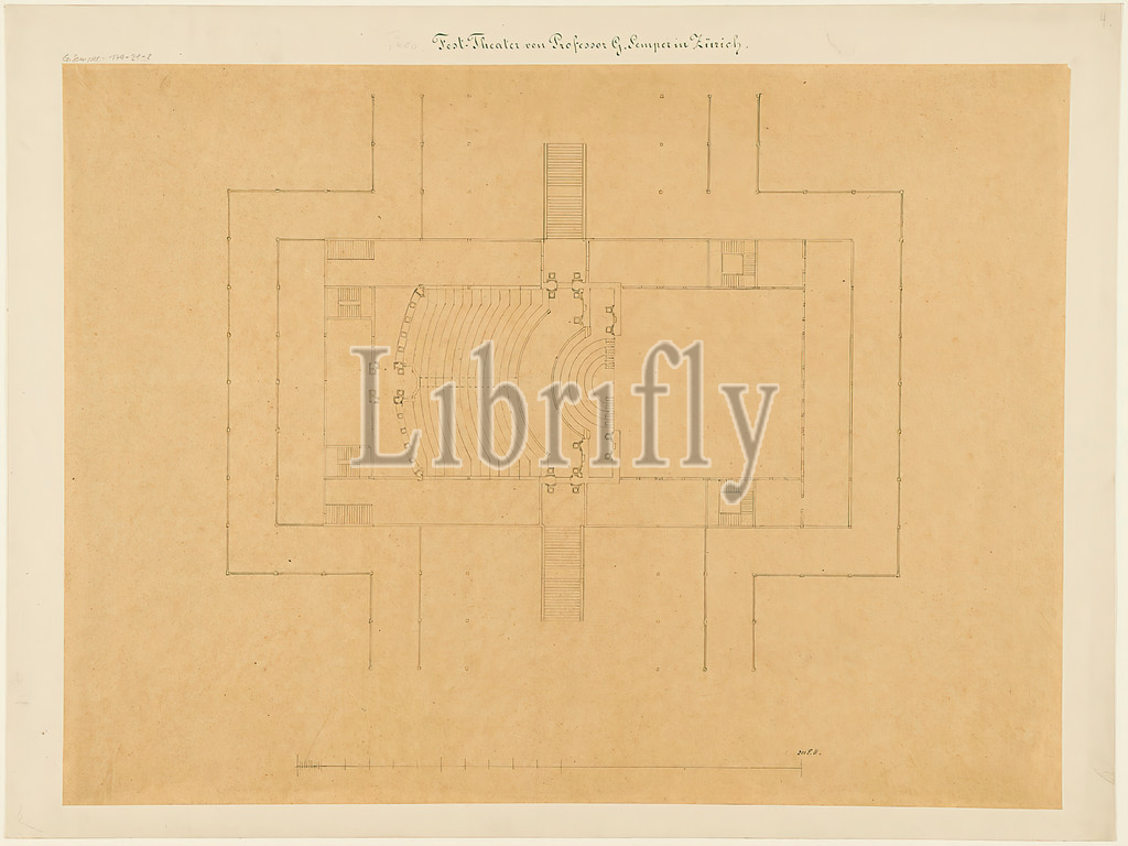 Gottfried Semper, floor plan, Design, provisional Richard Wagner Festival Theater, Glass Palace, Munich, Project C, transparent paper, drawing, sheet size, inscribed, recto, cardboard, in ink, Prov, added, lead, Festival Theater, Professor Gottfried Semper, Zurich, in lead, G, Semper 179-21-8, b, design drawings, draft, plan, building, opera house, architecture, architectural drawing, model