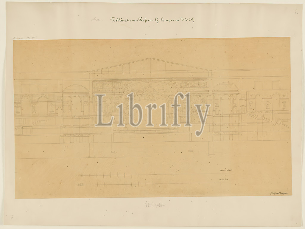 Gottfried Semper, preliminary design, Richard-Wagner-Festspielhaus, Munich, Cross-section, auditorium, tracing paper, drawing, sheet size, signed, in lead, Gottfried Semper, inscribed, recto, cardboard, in ink, Mon, added, lead, Festival Theater, Professor Gottfried Semper, Zurich, in lead, G, Semper 180-21-4, F, design drawings, cut, architecture, opera house, architecture, architectural drawing, model