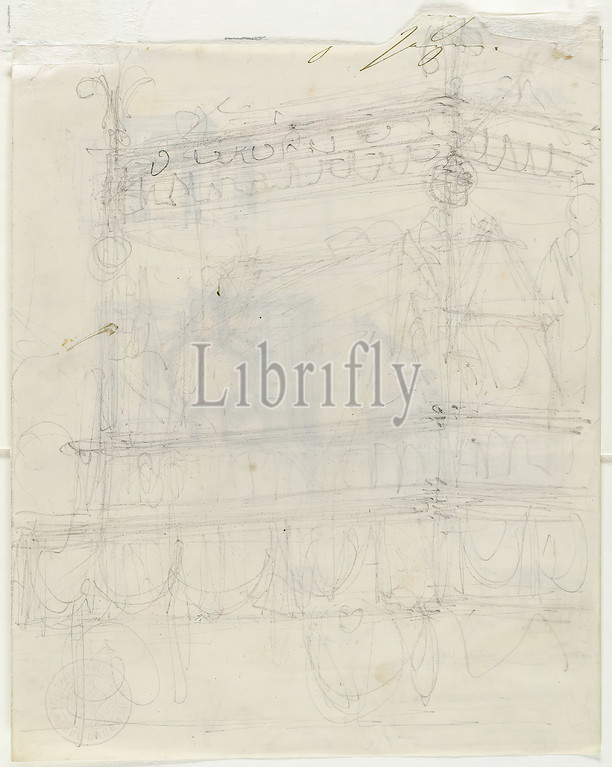 Gottfried Semper, sketch of the hearse of the Duke of Wellington. View over corner, paper, pencil, drawing, sheet size: height: 17.2 cm; width: 13.7 cm, design drawings, Death, Burial, sketches, funeral rites/cult of the dead, carriage, freight wagon, freight cart