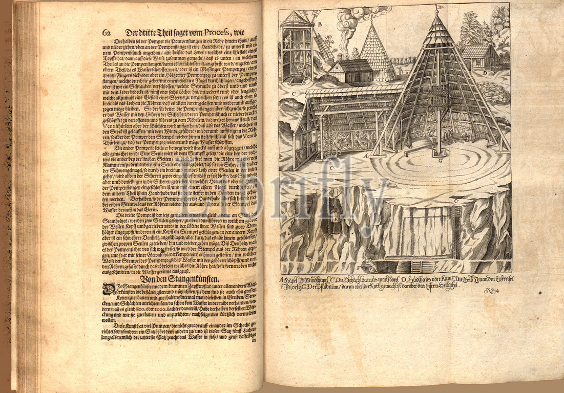 Göpelwerk, Copper engraving of a goepel movement, no. 14, according to p. 62, 1690, Georg Engelhard Löhneysen, Gottfried Liebezeit: Gründlicher und auszführlicher Bericht von Bergwercken: wie man dieselbigen nützlich und fruchtbarlich bauen, in glückliches Auffnehmen bringen, und in guten Wolstand beständig erahlten [...]. Stockholm & Hamburg: Liebezeit, 1690