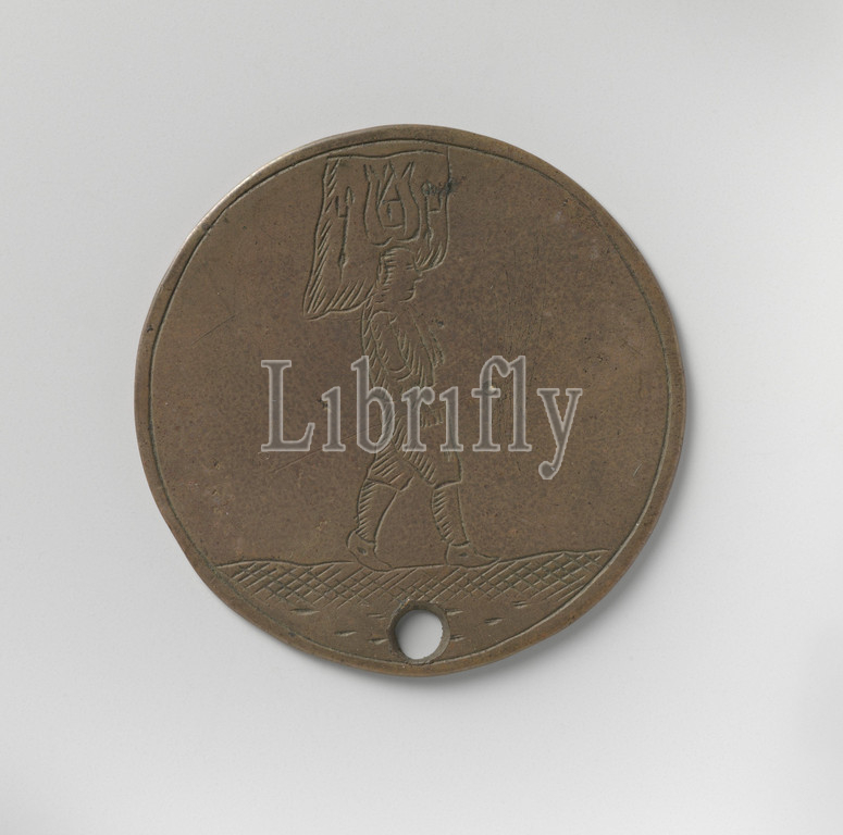 Grain Carriers and Pourers Guild of Amsterdam, Guild Medal of Henderick Eldersen of Amsterdam, Copper Medal with a hole in it, vz: right-facing man with burden on head. Reverse: inscription, Amsterdam, Henderick Eldersen, anonymous, 1683, copper (metal), engraving, d 3.4 cm × w 5.60 gr