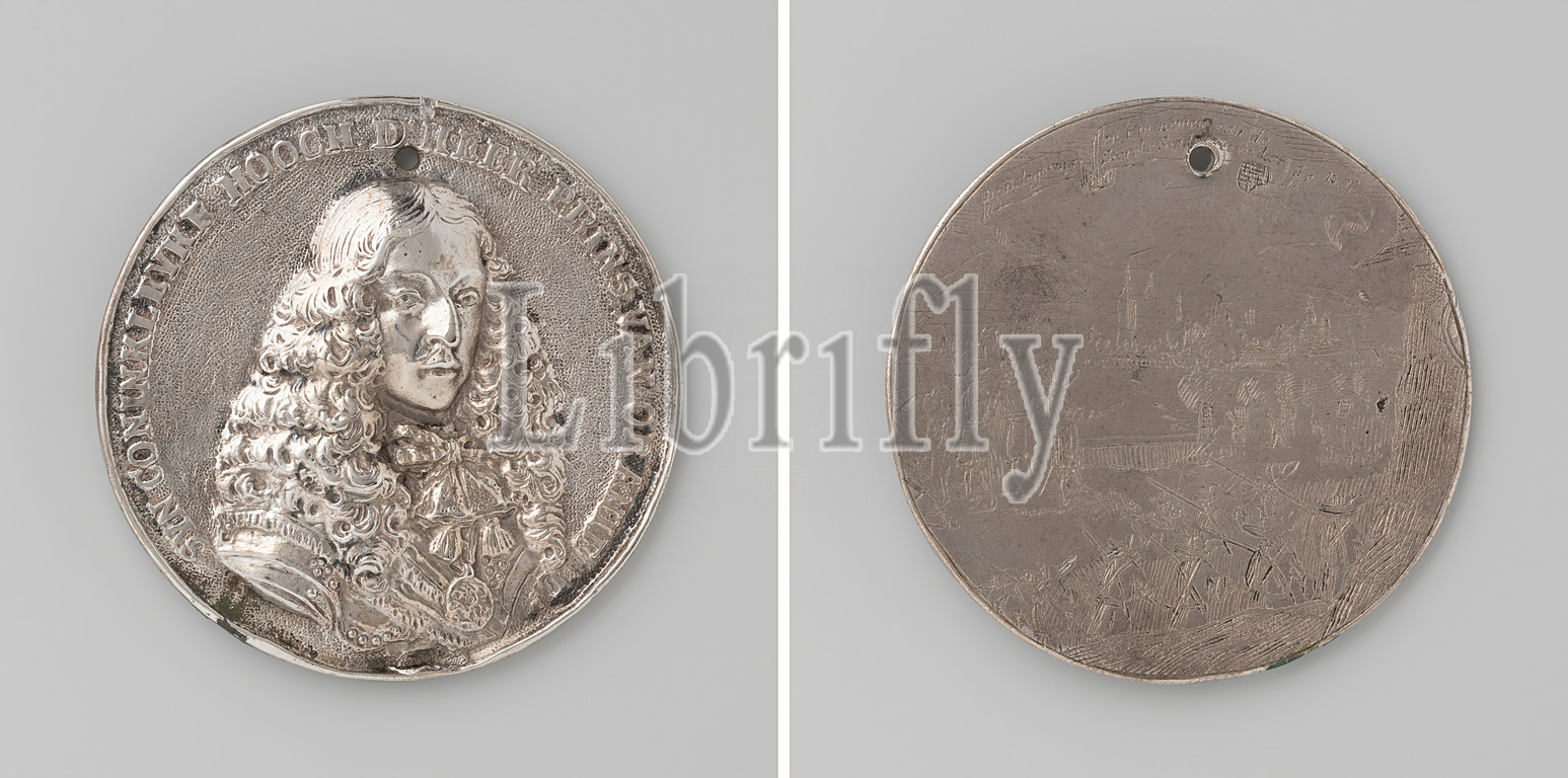 Grave, Prince William III, black-and-white Medal, Hole, Front, man's bust inside, inside, Reverse, city, besiegers under inscription, Noord-Brabant, Willem III, Prince, Orange, King, England, Scotland, Ireland, Roelof Hensbergen, 1674, black-and-white, metal, engraving