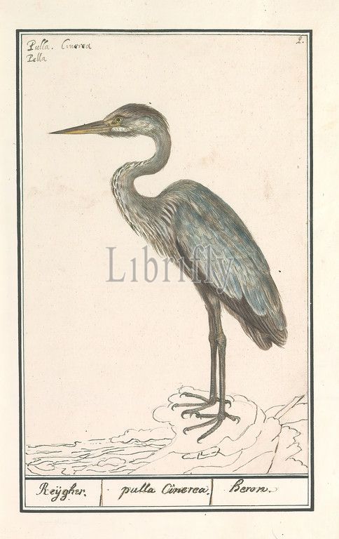 Great Blue Heron (Ardea cinerea), Reijgher. / pulla Cinerea. / Heron. (title on object), Great Blue Heron. Numbered top right: 2. Top left the Latin name. Part of the third album with drawings of birds. Fifth of twelve albums with drawings of animals, birds and plants known around 1600, commissioned by Emperor Rudolf II. With explanations in Dutch, Latin and French, shore birds and wading birds: heron, Anselmus Boetius de Boodt, 1596 - 1610, paper, watercolor (paint), deck paint, pencil, ink, pen, h 170 mm × w 267 mm