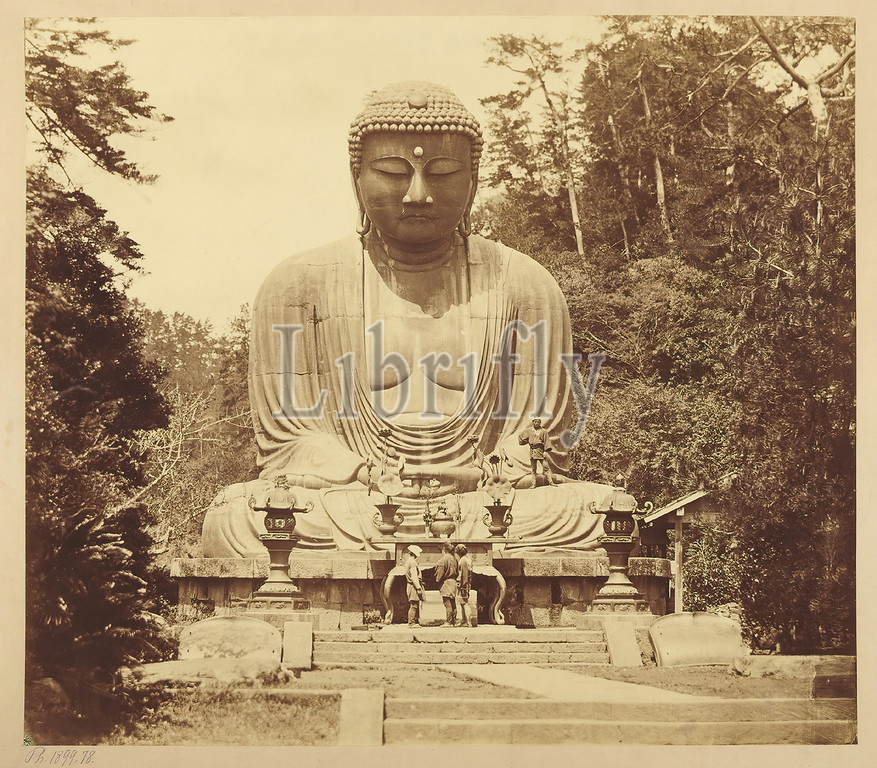 Great Buddha, Kamakura, albumin paper, black, white positive process, in lead, Great Buddha, Kamakura, travel photography, statues, pictures, cult objects, Hinduism, Buddhism, Jainism, Buddhist sculpture, Daibutsu, Great Buddha, the, popular motifs, Japanese travel photography, size, statue alone must, impressed, traveler, West, bronze sculpture, ruler Hojo Yasutoki, Kamakura, Tokyo, measures 13.35 meters, Aya Fujita