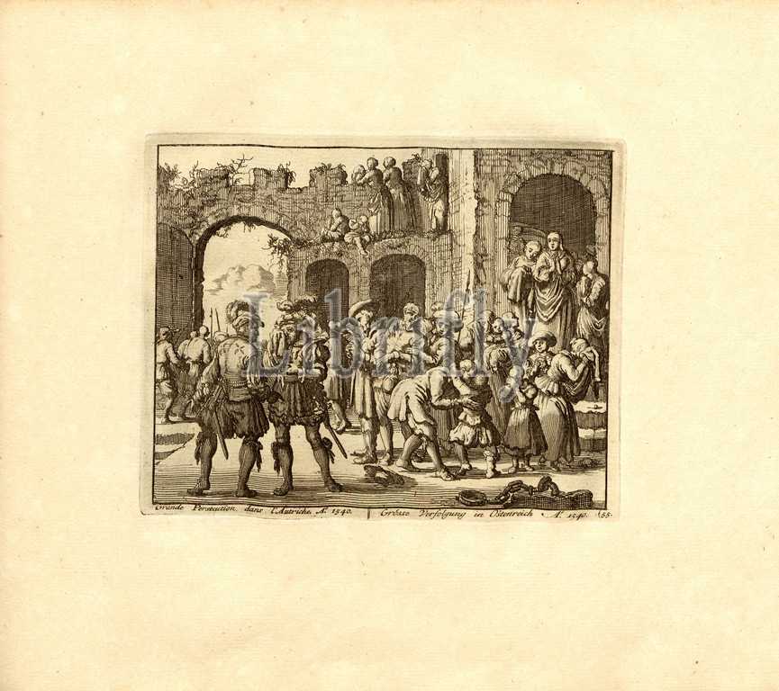 Great Persecution in Austria, Anno 1540, Parallel Title: Size Persecution in Austria A nn o 1540, copperplate engraving, 55.), p. 119, Luyken, Jan (inv. et fec.), Jan Luyken: Théâtre des martyrs: depuis la mort de J.Christ jusqu'à present: représenté en très belles tailles-douces = Schau-Bühne der Martyrer; gezeichnet und in Kuppfer gestochen. Leyde: chez Pierre Van der Aa, [1711]