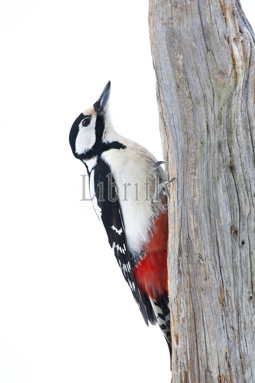 Great Spotted Woodpecker, perched, tree, snow covered taiga forest, Dendrocopos major, Finland, nature, bird, animal, wildlife, wild, fauna, natural, feather, sky, beak, wing, outdoor, freedom, colourful, Liszt, Natural History, ornithology, vertebrate animals, photography, color image