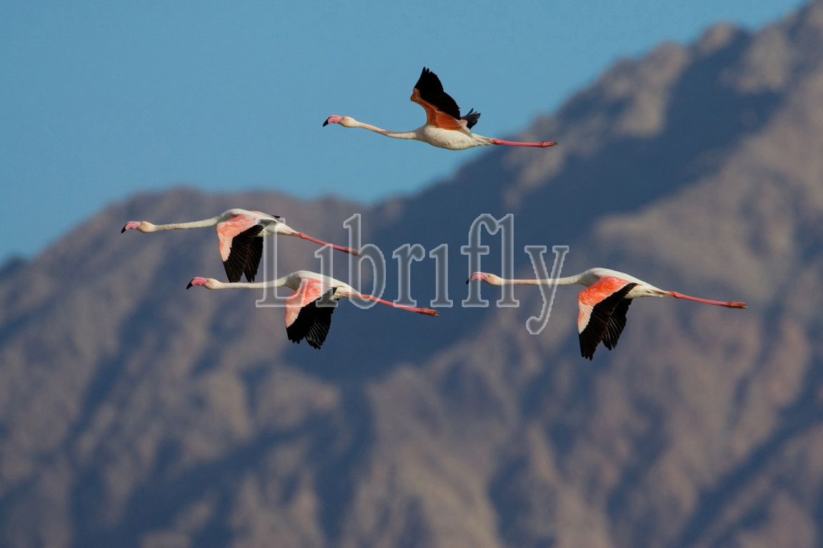 Greater Flamingos in flight, Phoenicopterus roseus