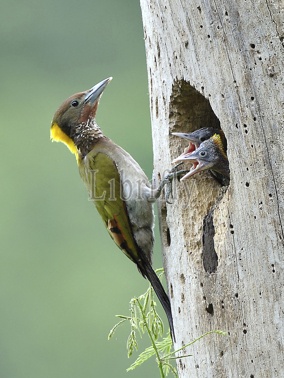 Greater Yellownape feeding its young, Chrysophlegma flavinucha