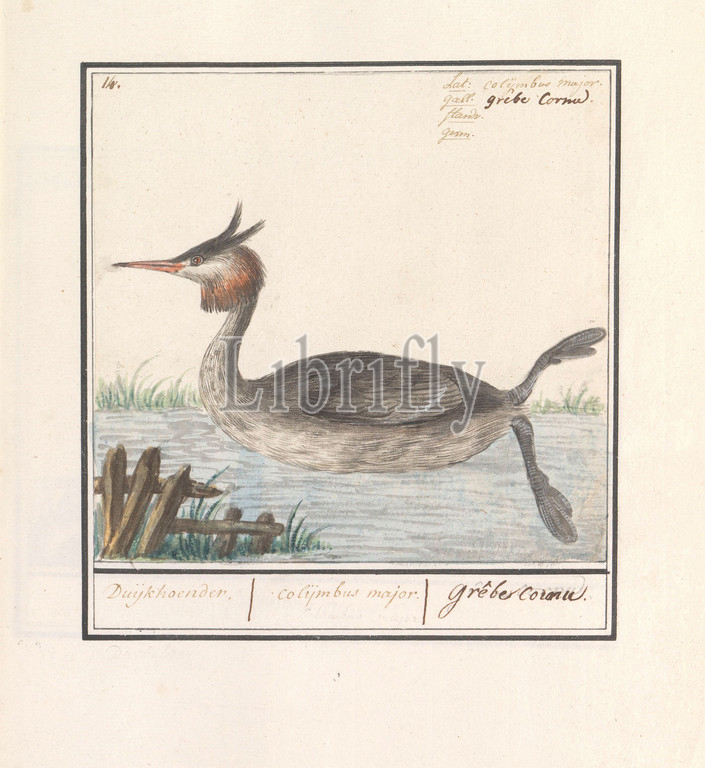 Grebe, Podiceps cristatus, Duijkhoender, colijmbus major, grê cornu, title, object, Numbered top left, 14, Top right, Latin, French name, Part, third album, drawings, birds, Fifth, twelve albums, animals, plants, 1600, commissioned, Emperor Rudolf II, explanation, Dutch, French, Anselmus Boetius de Boodt, 1596, 1610, paper, watercolor, paint, deck paint, pencil, chalk, ink, pen