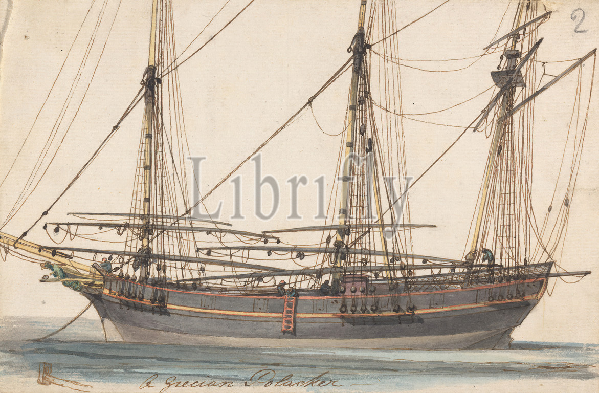 A Grecian Polacker, Joseph Cartwright, c.1789–1829, British, undated, Watercolor, with pen, in brown ink on medium, slightly textured, blued white, laid paper, mounted on, moderately thick, slightly textured, cream, wove paper, Mount: 17 × 15 13/16 inches (43.2 × 40.2 cm) and Sheet: 5 1/2 × 8 5/16 inches (14 × 21.1 cm)