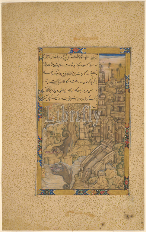 The Greedy Dog, Mughal period, late 16th century, India, Attributed to Farrukh Chela (active 1580-1604), India, Opaque watercolor and shell gold on paper, Image: 19.8 x 12.1 cm (7 13/16 x 4 3/4 in.), Outermost Border: 21.8 x 13.8 cm (8 9/16 x 5 7/16 in.), Paper: 33.4 x 20.8 cm (13 1/8 x 8 1/4 in.)