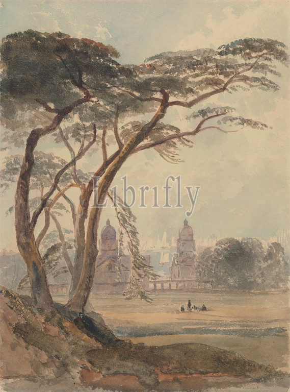 Greenwich, pupil, Peter DeWint, 1784–1849, British, Watercolor, graphite, medium, moderately textured, cream wove paper, Sheet, boats, buildings, figures, rivers, sailboats, trees, England, Europe, Greenwich, Thames, United Kingdom