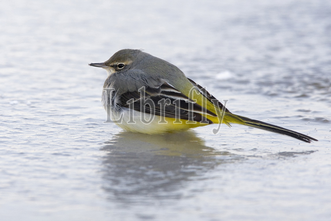 Grey Wagtail foraging in winter, Motacilla cinerea, Italy
