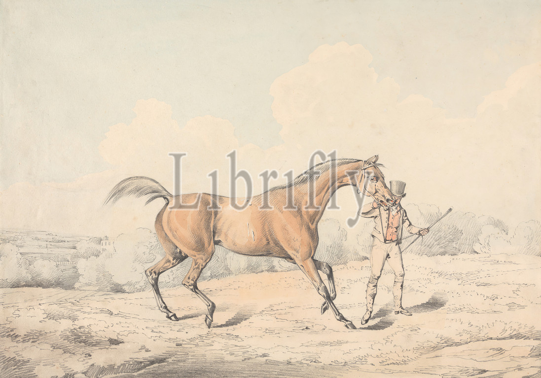 Groom Leading, Bay Horse, Henry Thomas Alken, 1785–1851, British, Graphite, watercolor, medium, moderately textured, blued white, wove paper, Sheet, groom, caretaker, horses, horse, animal, landscape, man, sporting art, trees, whip