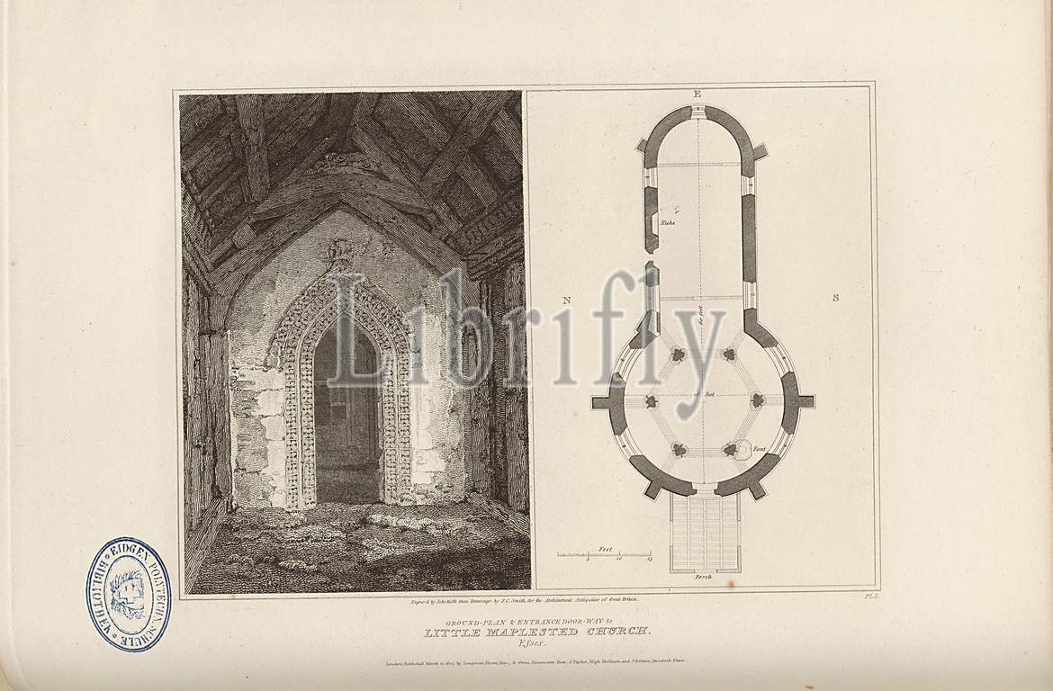 Ground-plan and entrance doorway to Little Maplestead Church, Essex, Plan and Door to St. John the Baptist Church at Little Maplestead in Essex, signed: Engraved by John Roffe, of Drawings by J.C. Smith, Fig. 26, Pl. I, according to p. 16, Smith, J. C. (Drawing); Roffe, John (engr.), 1807, John Britton: The architectural antiquities of Great Britain: represented and illustrated in a series of views, elevations, plans, sections and details of various ancient English edifices: with historical and descriptive accounts of each. Bd. 1. London: J. Taylor, 1807-1826
