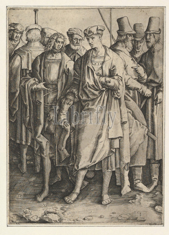Group, Armed Men, copy, n.d, Engraving, sheet, 4 3/8 x 3 1/8, 11.1 7.9 cm, Prints, Jan Muller, Netherlandish, Amsterdam, 1571–1628, After Lucas van Leyden, Leiden ca., 1494–1533, Leiden