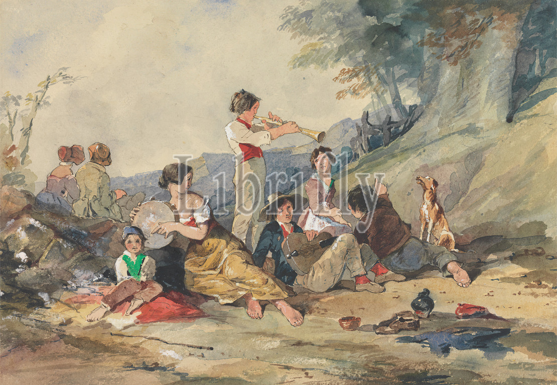 Group, Peasants, Musical Instruments, Attributed, John Absolon, 1815–1895, British, Watercolor, gouache, graphite, pen, brown ink, moderately thick, moderately textured, cream wove paper, Sheet, bonnets, branches, children, dog, animal, genre subject, gesture, guitar, hats, horn, musical instrument, landscape, leisure, men, mountains, music, musical instruments, peasants, pointing, pool, reflections, rocks, landforms, tambourine, trees, water, women