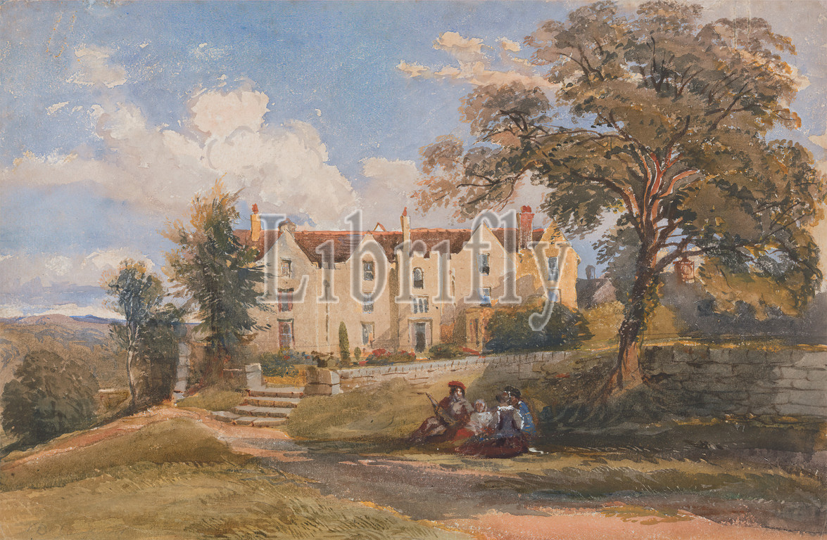 Group Seated, Grounds, Large House, David Cox Jr., 1809–1885, British, 1840, 1849, Watercolor, pen, brown ink, gouache, graphite, scratching out, moderately thick, moderately textured, cream wove paper, Sheet, Sheet, architectural subject, country house, landscape, stairs, trees, wall