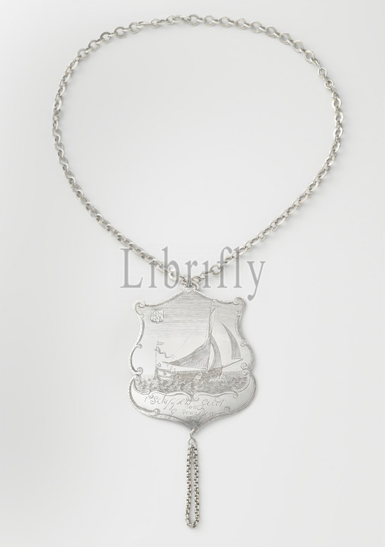 Guild shield, Silver shield of skippers' guild, engraved with a silver ship. Schippers' Guild by J. van den Berg 1777, J. van de Berg (Skipper), anonymous, Netherlands, 1777, silver (metal), engraving, h 12.2 cm × w 9.5, l 34 cm l 6.5 cm