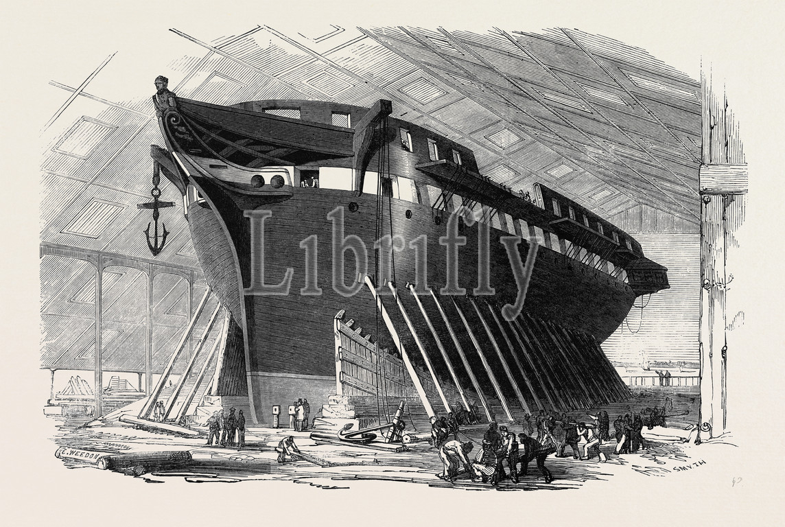 h.m., 50, gun, frigate, nankin, launched, day, saturday, march, 16, 1850, 1850 engraving, engraved image, history, illustrative technique, engravement, victorian, arts, culture, retro styled, vintage, retro, arkheia