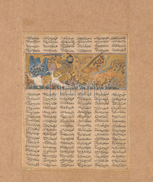 'Gushtasp Kills the Wolf of Fasiqun', Folio from a Shahnama (Book of Kings), ca. 1300–30, Attributed to Northwestern Iran or Baghdad, Ink, opaque watercolor, silver, and gold on paper, 6 1/2 x 5in. (16.5 x 12.7cm), Codices
