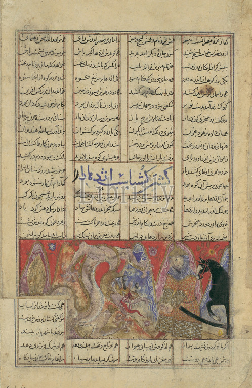Gushtasp Slays, Dragon, Mount Saqila, Folio, Shahnama, Book, Kings, Firdausi, ca, 1330–40, Attributed, Iran, Isfahan, Ink, opaque watercolor, gold, silver, paper, Page, 8 x 5 1/4, 20.3 13.3 cm, Codices, Gushtasp, Prince, living, disguise, Rum, order, win, hand, Caesar, youngest daughter, perform, mighty feat, slay, terrible dragon, courage, prowess Gushtasp prevailed, killed, monster