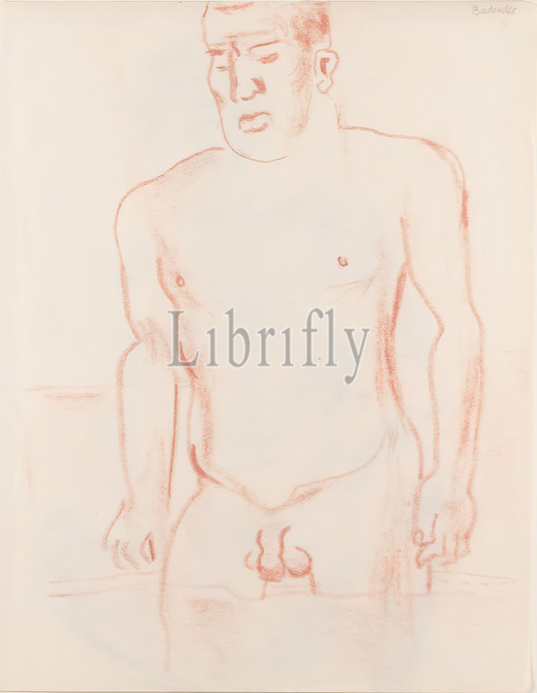 Gustav Heinrich Wolff, bather, drawing paper, pastel chalk, drawing, pastel, drawing paper, recto top right inscribed, pencil Bather, sketches, nude, male nude, standing male nude, bathing, movement, water, Classic Modernism, Naked man standing up, thighs, water, lowered gaze Single sheet, sketchbook, sheet 17, November 1929