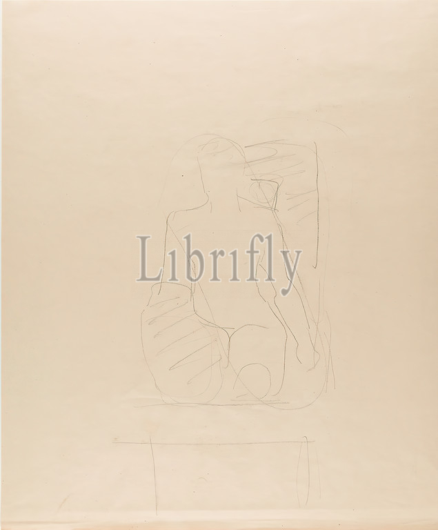 Gustav Heinrich Wolff, draft sketch for a sculpture, pencil, paper, drawing, lead on strong, brownish paper, total: height: 43 cm; width: 35,8 cm, drawing, graphics, sketches, draft drawings, human body/figure/nude, classical modernism, rough sketch (contours) of a kneeling figure on a pedestal in front of a block, obviously draft for a sculpture. Undated single sheet.